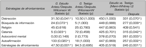 La Tabla 1 muestra los valores de la prueba de Mann-Whitney y la prueba de los rangos con signo de Wilcoxon en cuanto a las estrategias de afrontamiento en el Grupo Estudio y Testigo, antes y después de aplicar el programa. Se puede observar que después de aplicada la intervención psicológica en el Grupo Estudio, los datos muestran diferencias estadísticamente significativas en las estrategias: Distracción (p = 0,041), Búsqueda de Información (p = 0,073), Catarsis (p = 0,023) y Autoafirmación (p = 0,020), así como diferencias en cuanto a las estrategias activas (aumento de la actividad física) y pasivas (reposo) reportadas en la entrevista (p = 0,002). Estos resultados posibilitaron que el indicador Estrategias de Afrontamiento mostrara modificaciones con un valor de significación estadística (p = 0,001). Se obtienen, además, diferencias estadísticamente significativas con respecto al Grupo Testigo en todas dimensiones del afrontamiento excepto la Religión (U = 409; p = 0,541), incluyendo el indicador Estrategias de Afrontamiento (U = 245; p = 0,001).