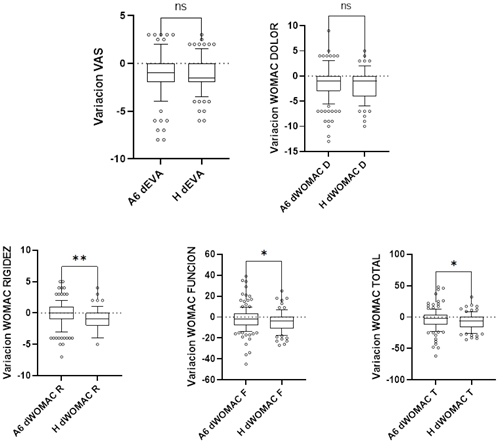Fig. 2. Cambios de las medias absolutas de las puntuaciones del WOMAC y EVA tras el tratamiento con hialuronato a los seis meses con A y al año con H. Variación absoluta desde los datos basales. A6M: seis meses tras la infiltración con A; H12M: 1 año tras el tratamiento con H. Los diagramas de cajas y bigotes representan la media, los cuartiles superior e inferior y los percentiles 10-90 %, respectivamente. El test de Mann-Whitney fue usado para comparar los grupos con un valor alfa establecido en 0,05 como significativo. Ns: no significativo.