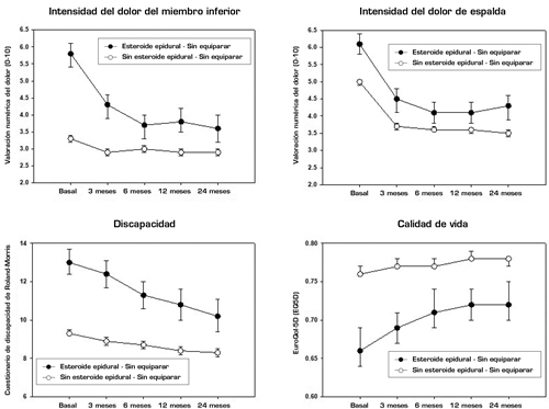 Las evoluciones del dolor, la discapacidad y la calidad de vida fueron a mejor durante los 24 meses tanto en los pacientes que recibieron IEE como en los que no recibieron ni IEE ni ninguna otra intervención lumbar (Anexo 1 y Figura 1). El grupo con IEE tenía peores puntuaciones en las medidas de resultado basales, pero su mejoría fue más marcada y la diferencia con respecto al grupo sin IEE fue reduciéndose con el tiempo. Sin embargo, las dos trayectorias no se superpusieron en ninguno de los resultados valorables, indicando que el grupo con IEE está formado por una población más difícil de pacientes con un pronóstico menos favorable.