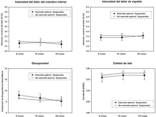 Fig. 2. Evolución del dolor, la discapacidad y la calidad de vida durante 24 meses en pacientes que recibieron IEE (n = 285) y pacientes equiparados en cuanto a puntuación de propensión que no recibieron IEE ni intervenciones lumbares (n = 483). De los 295 pacientes con IEE, 10 no pudieron equipararse. Las barras de error son intervalos de confianza del 95 %. Para crear la puntuación de propensión usamos un modelo que contenía variables de los dominios de características sociodemográficas, dolor, función, características psicosociales, calidad de vida y factores relacionados con la salud. Las covariables del modelo de ecuaciones de estimación generalizada son el momento de evaluuación (6, 12 y 24 meses), la interacción IEE/tiempo, el centro de reclutamiento y variables de los dominios de características sociodemográficas, dolor, función, características psicosociales, calidad de vida y factores relacionados con la salud. Dolor de miembros inferiores: diferencia entre grupos, p = 0,267; interacción tratamiento por tiempo, p = 0,387. Dolor de espalda: diferencia entre grupos, p = 0,612; interacción tratamiento por tiempo, p = 0,212. Discapacidad: diferencia entre grupos, p = 0,557; interacción tratamiento por tiempo, p = 0,151. Calidad de vida: diferencia entre grupos, p = 0,184; interacción tratamiento por tiempo, p = 0,917.