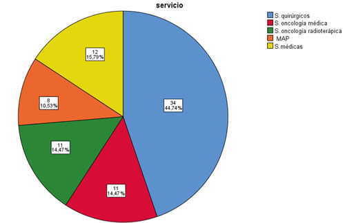 La remisión de estos pacientes en un 44,7 % la realizaron los servicios quirúrgicos y en menor medida Oncología médica y Radioterápica, Atención primaria y Medicina interna (Figura 1).