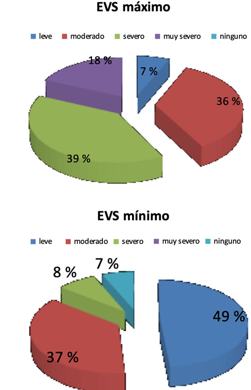 La intensidad de dolor en la primera consulta se recoge en la Figura 2, mediante la escala EVS. Se observa cómo el 75 % relataron que presentaban dolor moderado o severo en los momentos de mayor intensidad.