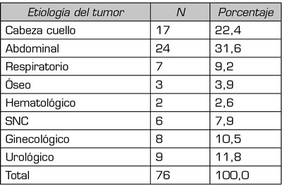 Se remitieron un total de 94 pacientes con el diagnóstico de dolor oncológico. Se excluyeron 18 pacientes porque ya estaban previamente en la unidad antes de noviembre del 2019 o porque tras la anamnesis, la causa del dolor no era el proceso oncológico, por lo que el número total de pacientes analizados fue de 78. El 63,2 % eran hombres y el 46,8 % mujeres. La edad media poblacional fue de 64,84 ± 12,623 años. Los tipos de tumores se encuentran descritos en la Tabla I y el origen del dolor en la Tabla II.