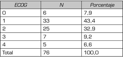 En la Tabla III vemos la escala ECOG en la que destaca que el 43,4 % de los pacientes remitidos no son capaces de desempeñar ningún trabajo y sus síntomas le obligan a permanecer en la cama durante varias horas al día.