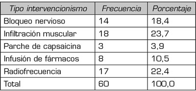 Tras la remisión y aceptación del paciente en la Unidad del dolor, se realizó un intervencionismo menor en el 56,6 % (43) de los pacientes y un intervencionismo mayor en el 2,6 %. Para interpretar estos datos, podemos compararlos con los publicados por el grupo de Pérez y cols. (22), donde nos indica que un 28,2 % de los pacientes recibieron terapia intervencionista. En otra publicación del mismo grupo (23), realizada posteriormente, se realizaron intervencionismos en 126 pacientes de 398 atendidos (31,65 %).
