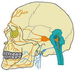 Fig. 1. Distribución cráneo facial del nervio vago (azul) y nervio trigémino (naranja).