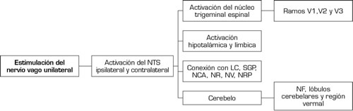 De manera clásica se ha considerado que el papel de la EVNI está relacionado con la modulación del reflejo trigeminal autonómico disminuyendo su componente parasimpático. En el nuevo entendimiento de las interacciones neuroanatómicas del sistema trigémino-vagal, un estímulo a nivel cervical sobre el NX de manera unilateral tiene la capacidad de generar activación bilateral a nivel del núcleo del tracto solitario, el núcleo parabraquial con una comunicación directa hacia el hipocampo (4,5). De manera adicional, el estudio de Henssen y cols. (6) propone la comunicación con los núcleos del rafe, los núcleos vermales y fastigiales a nivel cerebelar y el locus coeruleus. Estas estructuras están implicadas directamente en la modulación del dolor debido a su interacción con la sustancia gris periacueductal y la activación de las vías GABAérgicas y serotoninérgicas (7) (Figura 2).