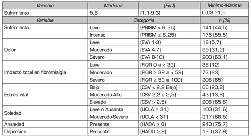 Method: A cross-sectional study was conducted in an institution specialized in chronic pain management. The degree of suffering (PRISM), level of pain (EVA), impact of FM (FIQR), loneliness (UCLA), anxiety and depression (HADS), stressful life events (CSV) and sociodemographic and clinical characteristics were evaluated. An explanatory model was proposed using logistic regression.