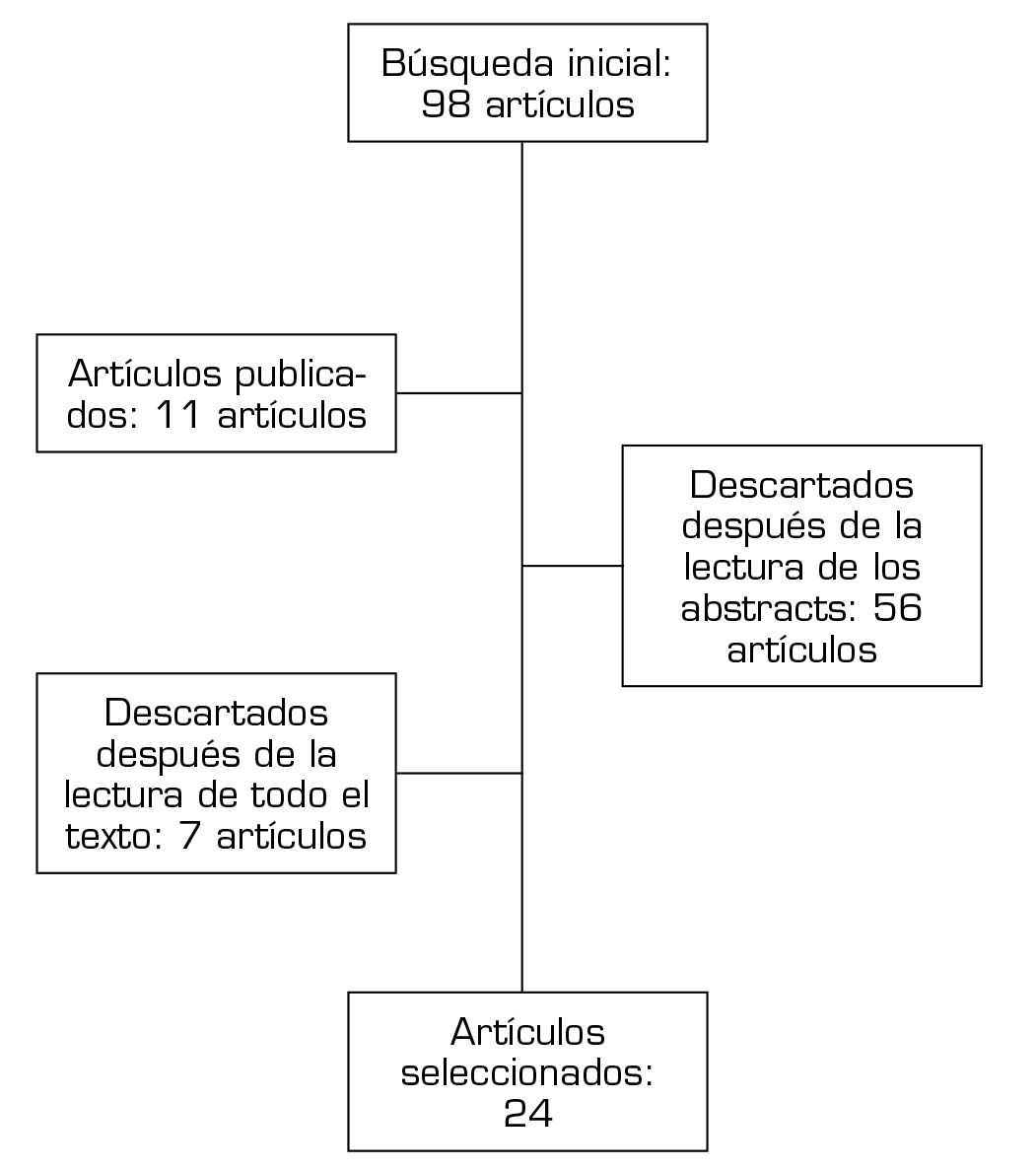 Se encontraron 98 artículos de los cuales 11 fueron repetidos entre PUBMED y EMBASE. Los 87 artículos restantes fueron revisados de forma independiente por cada uno de los autores, se realizó una lectura del resumen y se escogieron artículos que correspondieran con estudios experimentales in vivo o in vitro, revisiones sistemáticas y ensayos clínicos. Asimismo, se excluyeron publicaciones correspondientes a artículos teóricos. Se seleccionaron 31 artículos, los cuales fueron leídos en su totalidad para posteriormente ser filtrados por relevancia, finalmente se incluyeron 24 artículos en nuestra revisión de la literatura (Figura 1)