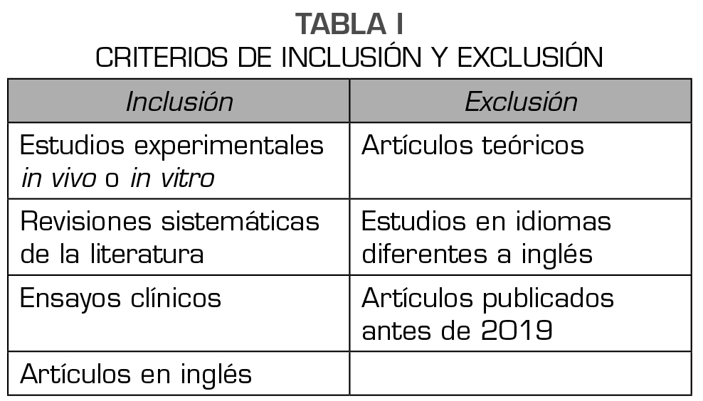 Se realizó una revisión bibliográfica a partir de los principios recomendados por PRISMA (Preferred Reporting Items for Systematic Reviews and Meta-analysis). La búsqueda se llevó a cabo en las bases de datos PUBMED y EMBASE. Se utilizaron los términos de búsqueda: “Nucleus pulposus”, “Stem cells” “low back pain, exosomes” y “transplanted tissue”, utilizando conectores lógicos como “AND”, “NOT”, y “OR”. Se uso el programa “Rayyan” para recopilar la información y facilitar el proceso de análisis. La aplicación Rayyan es una plataforma que permite una manipulación fácil de la información obtenida. De una manera independiente, por cada uno de los autores, se hizo la revisión del resumen de cada uno de los artículos encontrados y se le aplicaron los criterios de inclusión y exclusión. Los criterios de inclusión y exclusión establecidos fueron (Tabla I).