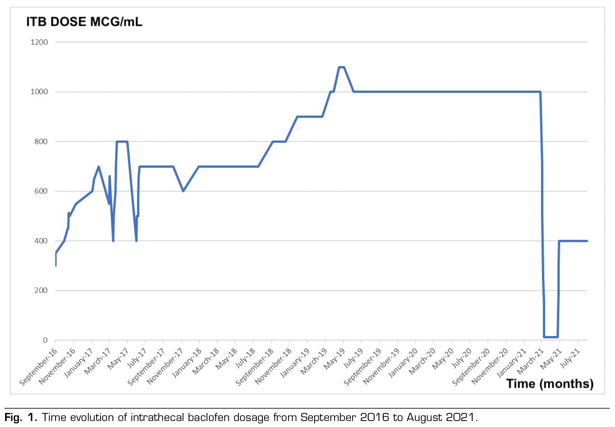 Our clinical case concurs with the literature, in which at 24 months of implantation of the pump the dose is stabilized without clinical benefits (as shown in Figure 1). Additionally, Figure 2 shows the evolution of spasticity over time.