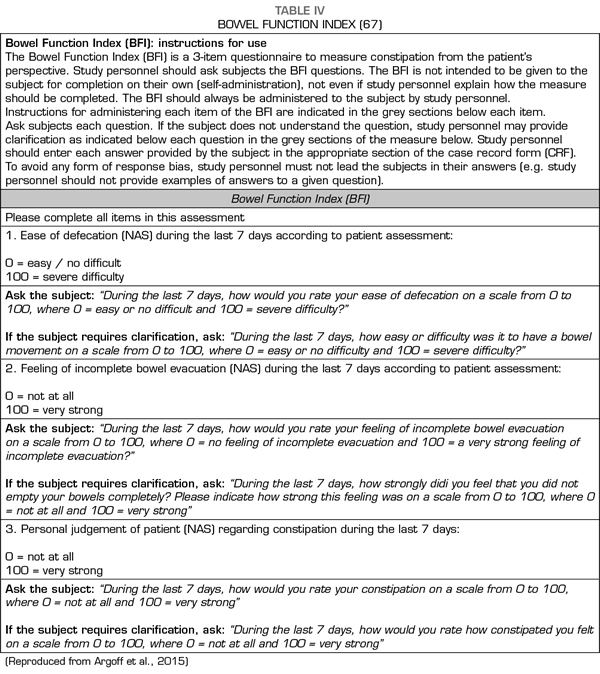 68. Rentz AM, Yu R, Müller-Lissner S, Leyendecker P. Validation of the Bowel Function Index to detect clinically meaningful changes in opioid-induced constipation. J Med Econ. 2009;12(4):371-83.
