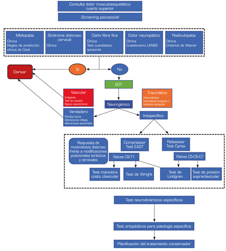 Thoracic outlet syndrome (SOT) is a controversial condition to this day, caused by compression of neurovascular structures in their passage between the neck and thorax. It is classified as vascular and neurogenic. If the electrophysiological tests are not positive it is subclassified as nonspecific neurogenic. This is between 95-98 % of cases, but its diagnostic criteria are not yet clear. The main aspects to be taken into account during the clinical examination are reviewed to guide the diagnosis of patients with nonspecific neurogenic SOT, such as symptoms, triggers, differential diagnosis, assessment scales and psychosocial factors.