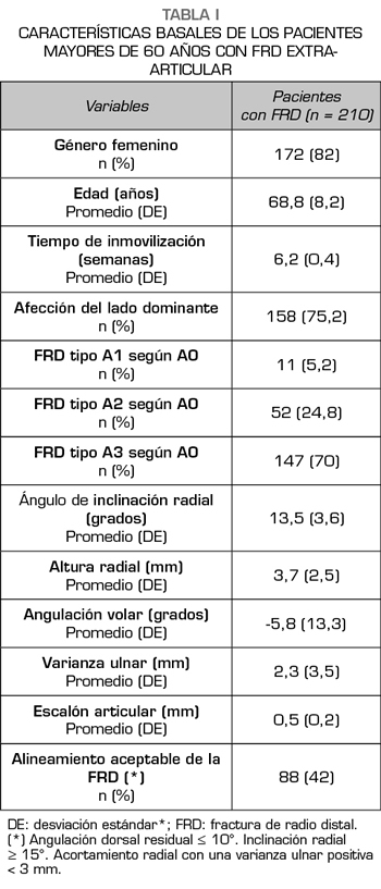 Material y método: El presente estudio correlacional fue realizado en el Hospital Clínico San Borja Arriarán. Se reclutaron de forma prospectiva 210 pacientes con FRD extrarticular según la clasificación AO. Para evaluar los resultados de la reducción ortopédica se evaluaron índices radiológicos como la inclinación radial, la angulación dorsal residual y la varianza ulnar. Tras la retirada de la inmovilización y a los 6 meses de seguimiento se evaluó la intensidad del dolor con la escala visual analógica (EVA), la función de la muñeca con el cuestionario de evaluación de la muñeca valorada por el paciente (PRWE) y la fuerza de puño con un dinamómetro.