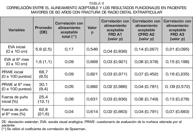 Conclusión: A corto y medio plazo no existe una correlación significativa entre el alineamiento aceptable basado en índices radiológicos y el dolor y la función de pacientes mayores de 60 años con FRD extrarticular tratados de manera conservadora.