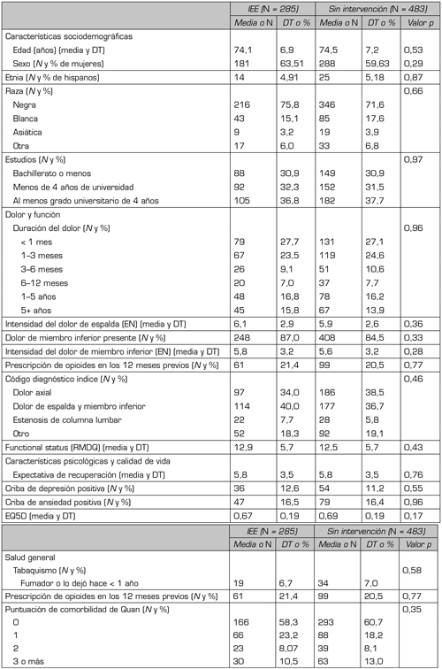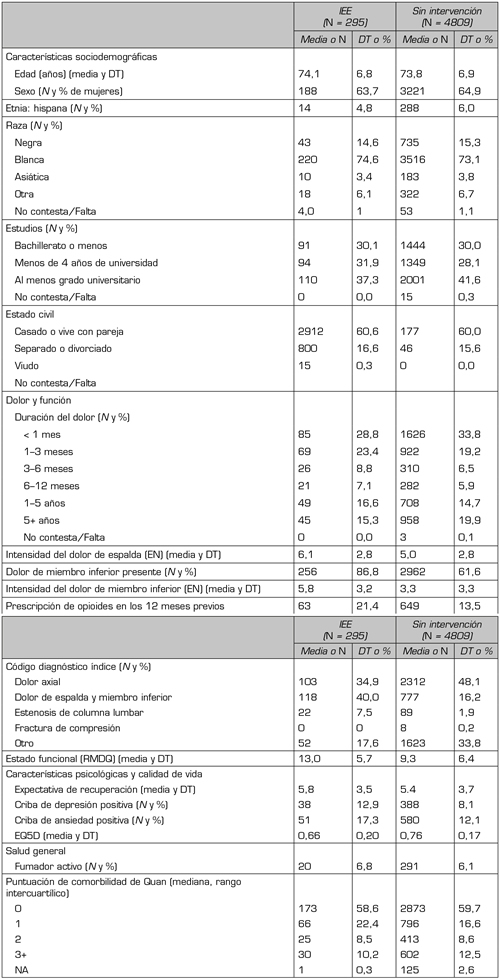 Métodos: Estudiamos prospectivamente a pacientes de ≥ 65 años de edad que acudieron a la atención primaria con nuevos episodios de dolor de espalda en tres sistemas sanitarios estadounidenses (registro BOLD). Los resultados a evaluar fueron la intensidad del dolor de miembros inferiores y de espalda, la discapacidad y la calidad de vida, valorados en el momento basal y a los 3, 6, 12 y 24 meses de seguimiento. Clasificamos a los participantes en: (1) IEE en los 6 meses siguientes a la visita inicial (n = 295); (2) sin IEE en el plazo de 6 meses (n = 4809); (3) sin IEE en el plazo de 6 meses, puntuación de propensión equiparada a la del grupo 1 (n = 483). Analizamos los datos mediante regresión lineal y ecuaciones de estimación generalizadas.
