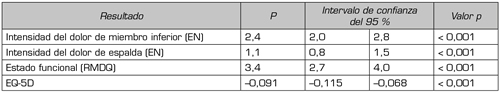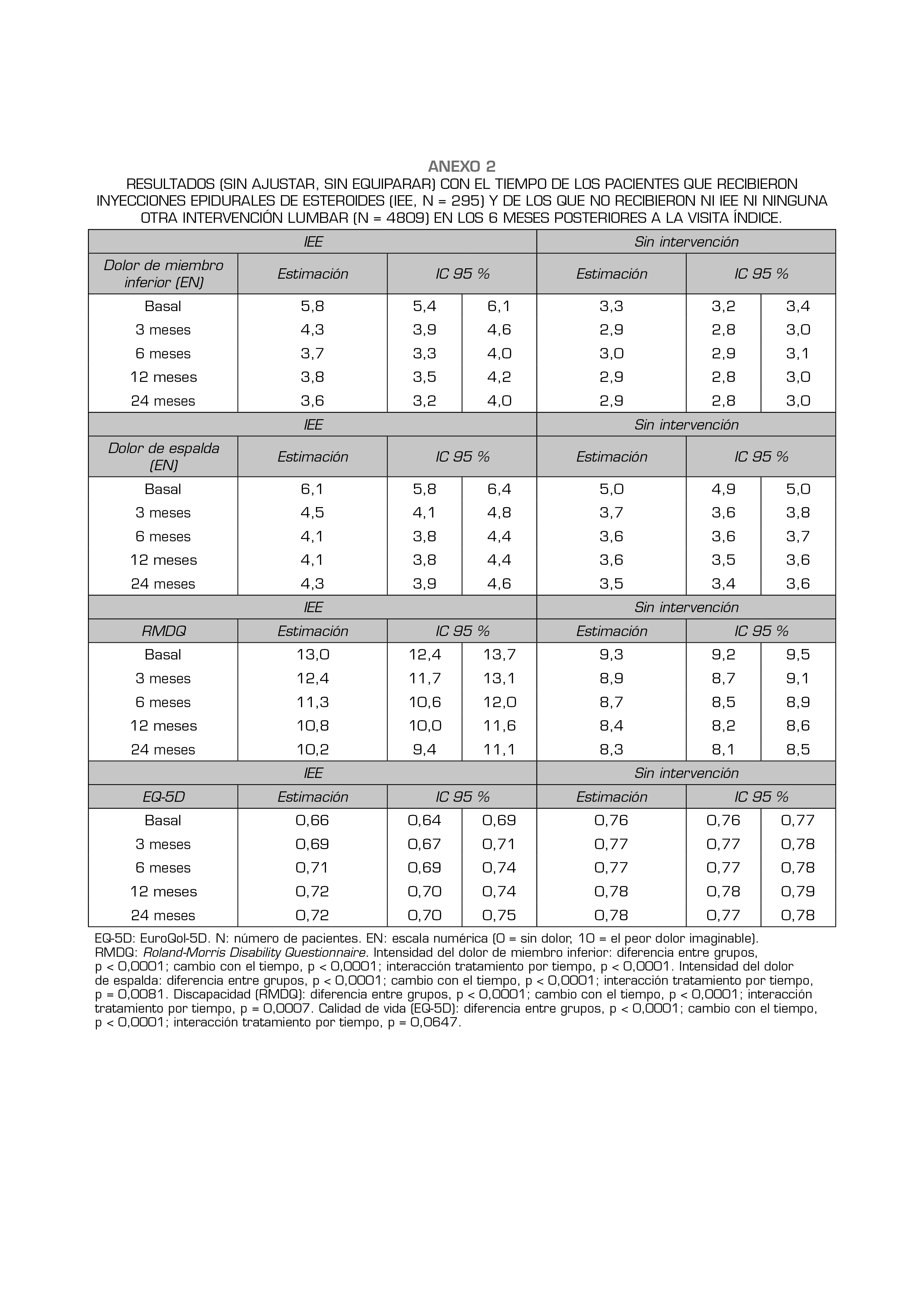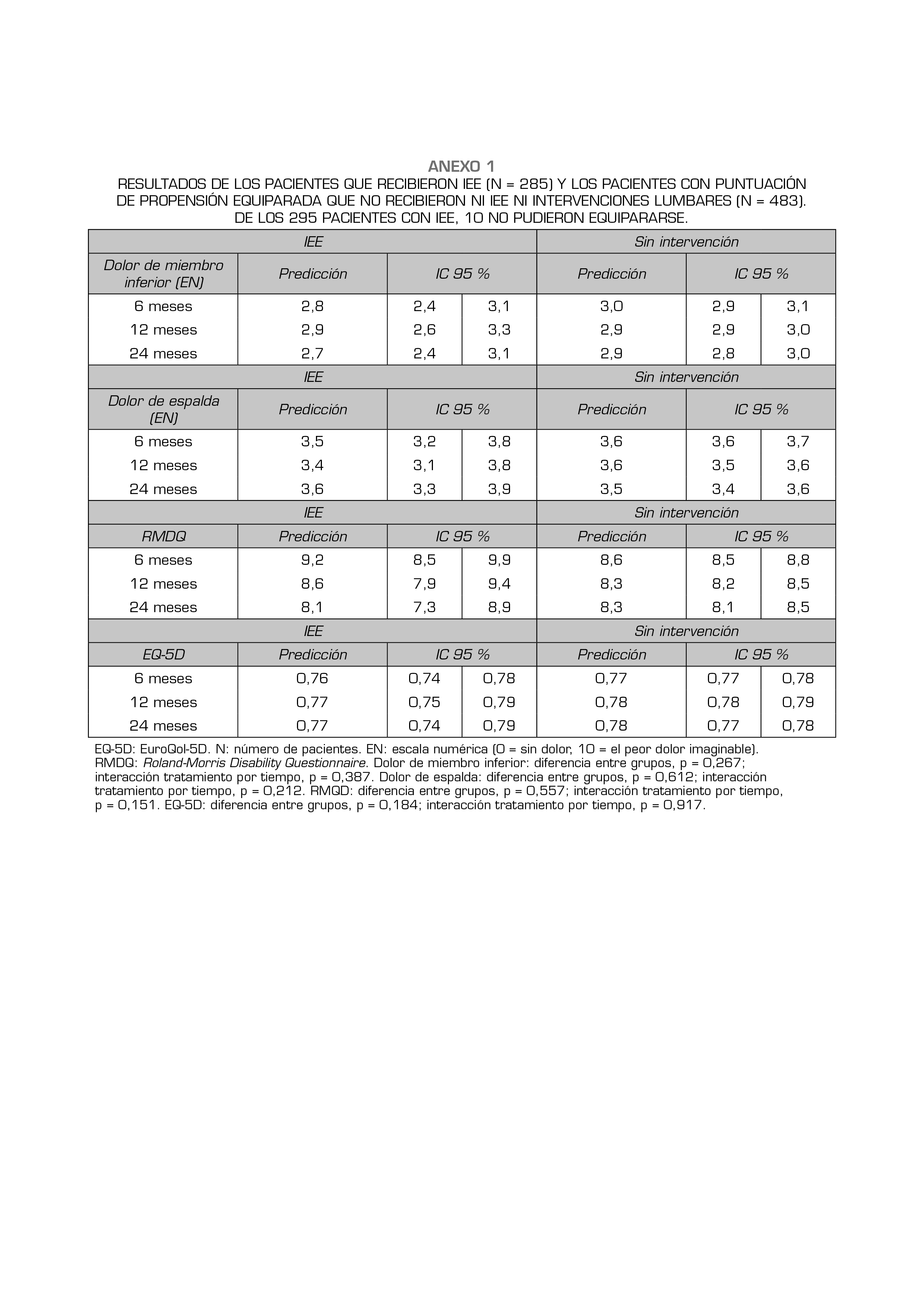Resultados: La intensidad del dolor, la discapacidad y la calidad de vida basales fueron significativamente peores en los pacientes con IEE (grupo 1) que en los del grupo 2. La mejoría de todos los resultados evaluables desde el momento basal hasta los 24 meses fue estadísticamente significativa para el grupo 1. Sin embargo, no se observaron diferencias estadísticamente significativas entre las evoluciones de los resultados en los grupos con puntuaciones de propensión equiparadas, 1 y 3.