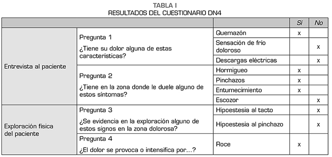 8. Perez C, Galvez R, Huelbes S, Insausti J, Bouhassira D, Diaz S, et al. Validity and reliability of the Spanish version of the DN4 (Douleur Neuropathique 4 questions) questionnaire for differential diagnosis of pain syndromes associated to a neuropathic or somatic component. Health Qual Life Outcomes. 2007;5:66. DOI: 10.1186/1477-7525-5-66.
