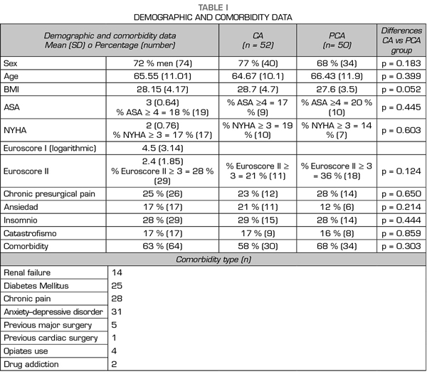 Pacientes y métodos: Estudio prospectivo de todos los pacientes sometidos a CC con CEC, durante los primeros 3 días del postoperatorio (DPO). Se incluyeron 102 pacientes en dos periodos, noviembre de 2016, con analgesia convencional (AC) y enero-febrero de 2017 con PCA.