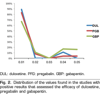 Methods: A literature search was conducted selecting randomized clinical trials that evaluated the efficacy of pregabalin, gabapentin and duloxetine in neuropathic pain. The p-curve analysis of the studies with statistically significant results was applied to study their distribution.