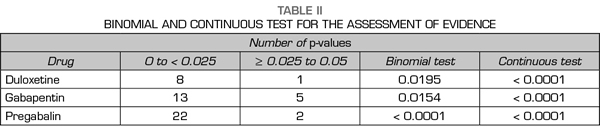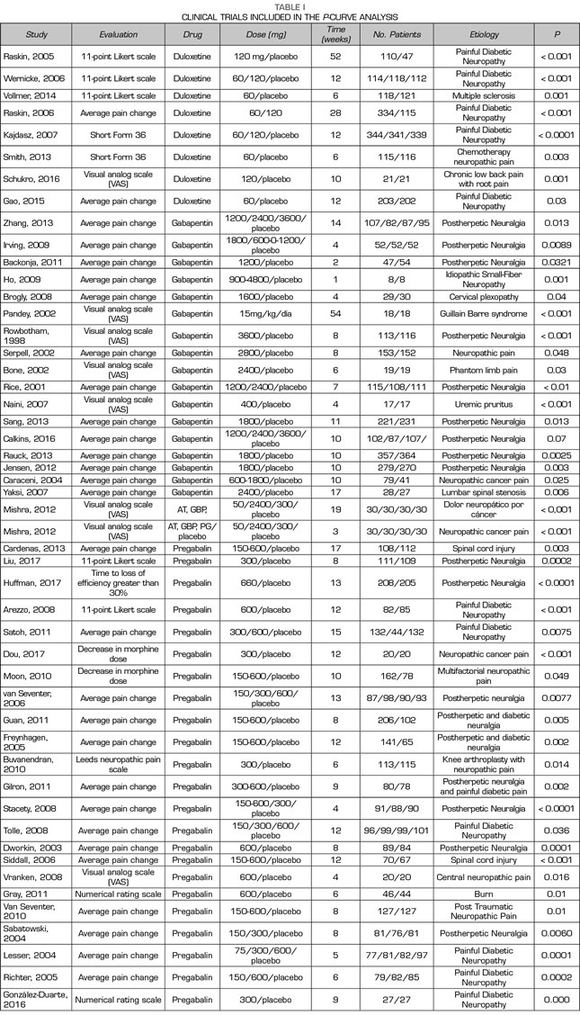 Métodos: Se realizó una búsqueda bibliográfica seleccionando ensayos clínicos aleatorizados que evaluaban la eficacia de pregabalina, gabapentina y duloxetina en dolor neuropático. Se aplicó el análisis de curva-p de los estudios con resultados estadísticamente significativos para estudiar su distribución.