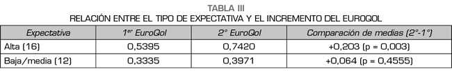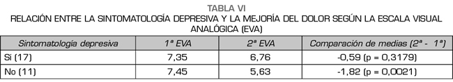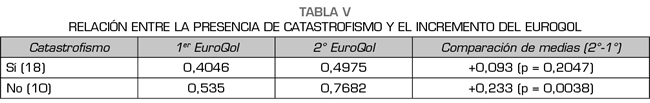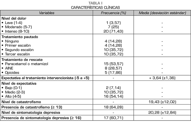 Resultados: Participaron 28 pacientes (75 % mujeres), con una media de edad de 60 ± 11,8 años. La puntuación basal en la escala visual analógica (EVA) fue de 7,64 ± 1,42 y la puntuación basal en el EuroQol fue de 0,451 ± 0,202. A las 4 semanas del procedimiento la EVA fue de 6,32 ± 1,66 y el EuroQol de 0,594 ± 0,242. Si bien todas las variables estudiadas mostraron un papel relevante en la respuesta clínica, la variable catastrofismo fue la que presentó mayor asociación con una escasa mejoría clínica (p = 0,001).