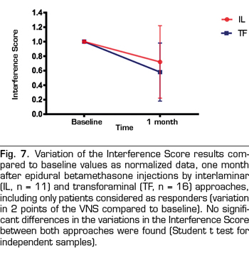 Results: Fifty four patients were treated with epidural betamethasone. In 29 the parasagittal interlaminar route was utilized while 25 were treated by the transforaminal route. A 20 % reduction in baseline VNS was observed with the interlaminar route and 36 % reduction with transforaminal approach. Intensity and Interference Scores were also reduced. This reductions were statistically significant when comparing to baseline data (paired t test) but differences between groups were not significant (unpaired t test). However the number of positive responses as defined above was greater in the transforaminal group, 64 % versus 38 % in the interlaminar group, statistically signifi cant difference using the Chi Square analysis (p=0.01). In patients with positive responses, interlaminar and transforaminal betamethasone produce clinical and statistically significant reductions in pain intensity and interference, without difference between groups.