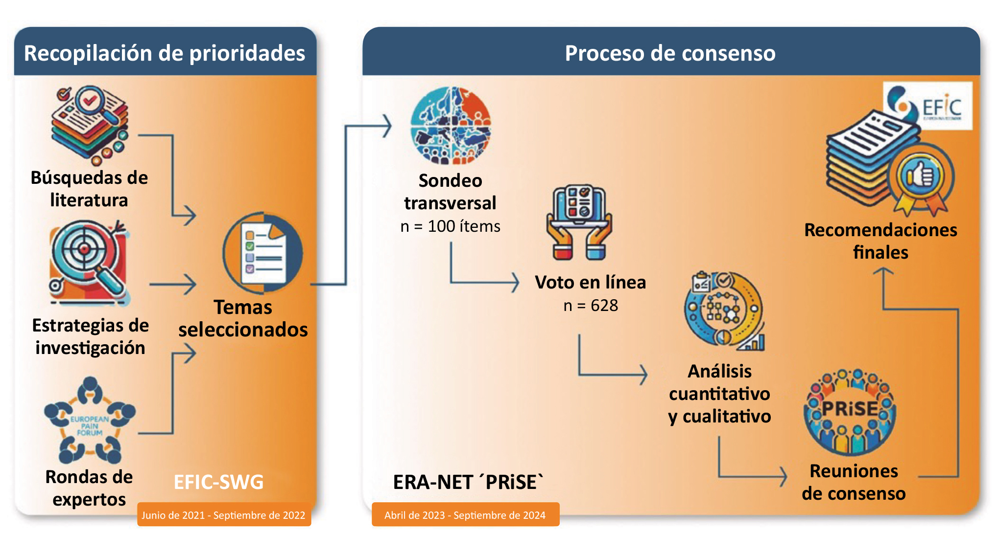 Métodos: El estudio ha utilizado múltiples métodos, incluyendo búsquedas de literatura, debates de expertos multidisciplinares, un sondeo y una reunión de consenso final. El sondeo transversal se realizó entre 628 investigadores del dolor, médicos clínicos, educadores y profesionales de la industria europeos para obtener la clasificación y la jerarquía de las prioridades en la investigación sobre el dolor. La reunión de consenso final involucró a un comité de expertos multidisciplinares incluyendo a personas con experiencia acumulada de 23 países. El sondeo muestra los debates guiados en los que se acordaron las máximas prioridades.