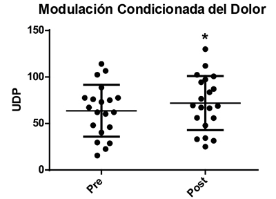Results: In the group with pain, the pressure pain threshold value was lower than in the group without pain in all the points evaluated. The pain threshold value at the mean pressure of the four regions analyzed in the group with pain, turned out to be lower than in the group without pain, 32.7 ± 10 Newtons versus 42 ± 11.7 Newtons (p = 0.004). The mean pressure pain threshold was lower in female patients than in male patients, 36.6 ± 9 Newtons versus 48 ± 11 Newtons (p = 0.001). In the 20 healthy volunteers who underwent the conditioned modulation of pain test at the trapezius level, the pain threshold at the initial pressure was 63 ± 27 Newtons and the final pressure was 72 ± 28 Newtons, with an average increase of 9 Newtons (14.2 %). In the 16 in which the temporal summation test was carried out, it was found that the pain level of the numerical visual scale went from 4.1 ± 1.0 to 6.5 ± 1.5 between the first and tenth stimulus.