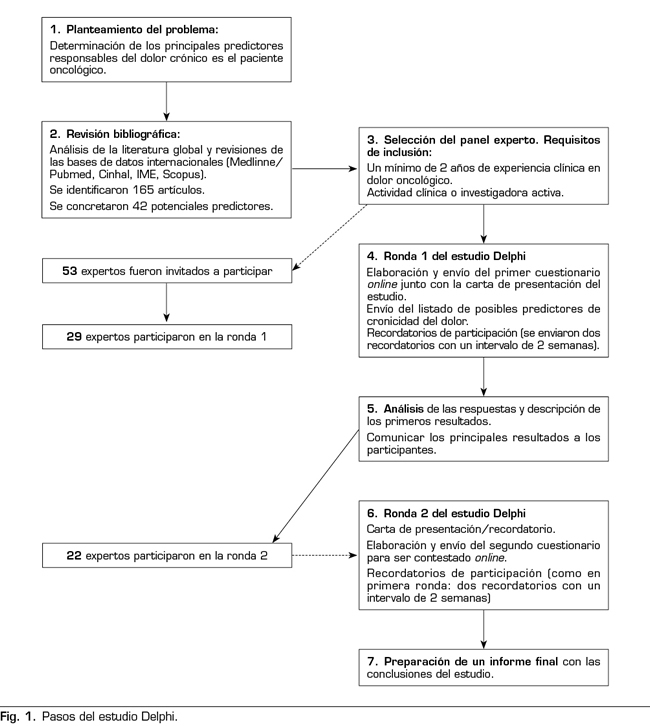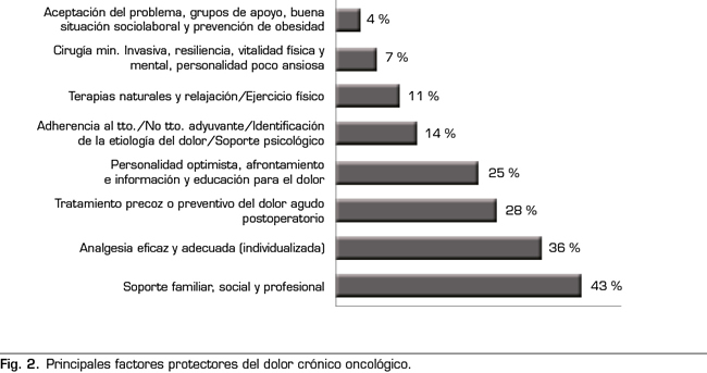 Resultados: Dos rondas fueron suficientes para alcanzar el consenso. Un total de 22 expertos participaron en ambas rondas. Los principales factores de riesgo identificados fueron: el proceso oncológico, el dolor mal controlado y los factores psicológicos, particularmente el catastrofismo. Entre los factores protectores destacaron: soporte social, tratamiento precoz del dolor, personalidad optimista y adherencia al tratamiento.