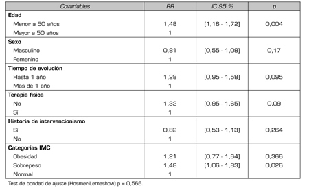 En el análisis multivariado, las variables que mostraron significancia estadística frente a fallo terapéutico fueron: edad menor de 50 años OR 2,7, IC [1,37 - 5,34] p = 0,004, y sobrepeso OR 2,36, IC [1,11 - 5,04], p = 0,026.