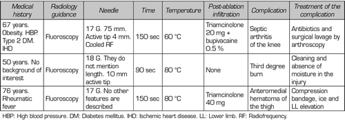 Results: After analyzing five open clinical trials, one cross-sectional study, four prospective observational studies, eight neuroanatomy studies, three retrospective studies, four clinical cases, two case series, three literature reviews and three randomized, double blind, controlled trials; we found genicular nerve radiofrequency achieves a pain reduction and functional improvement with a variable duration, between three and twelve months. There is no consensus regarding the neuroanatomy of the knee joint capsule, the location of the targets, the radiofrequency parameters used and the usefulness of diagnostic blocks.