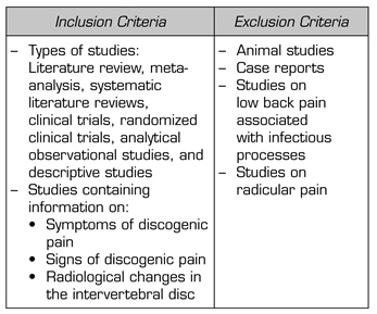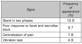 Results: In the mapping review, the most frequent symptom was axial low back pain, followed by the absence of radicular pain. A lower frequency of description was observed in the literature regarding the signs associated with disc pain, finding mention only in 12 % of the articles of biphasic movements when passing from sitting to standing. The centralization of pain to the physical examination, a positive vibration test and the absence of improvement with facet and sacroiliac infiltration, were other signs found in the review. As for the diagnostic images, the Pfirrmann scale had the highest frequency of appearance, followed by the HIZ (High intensity zone) and Modic changes.