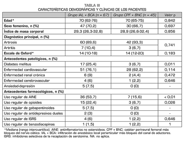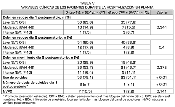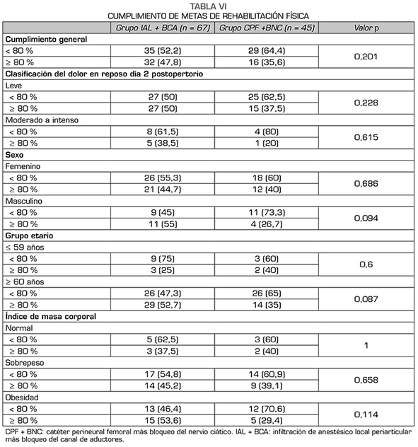 Resultados: Se analizaron 112 pacientes (67 en IAL + BCA y 45 en CPF + BNC). Ambas poblaciones fueron comparables en variables demográficas. La mediana del dolor en reposo en el primer y segundo día postoperatorios fue EVN 2/10 para ambos grupos. El promedio del dolor en movimiento en el segundo día postoperatorio fue EVN 5/10 para los pacientes con IAL + BCA y 4/10 para los pacientes con CPF + BNC, p = 0,073. El porcentaje de pacientes que cumplieron el 80 % o más de las metas de rehabilitación fue similar en ambos grupos (p = 0,201).
