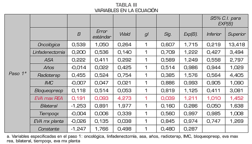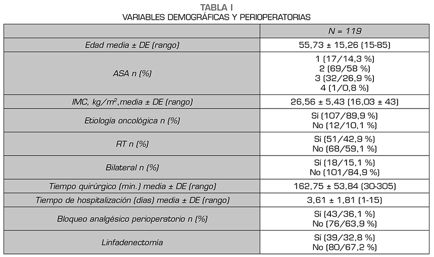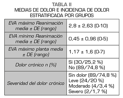 Resultados: De los 119 pacientes analizados, 30 pacientes refirieron dolor (25,2 %). La intensidad fue leve en 24 pacientes, moderado en 4 y severo en 2. No hubo relación entre el riesgo de dolor crónico y cualquiera de las variables analizadas.