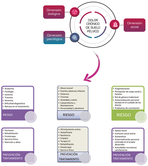 Se ha realizado una revisión no sistemática de carácter narrativo en Pubmed, Scholar Google y búsqueda manual desde 2012 hasta 2022. Se analiza la experiencia de dolor de suelo pélvico desde la dimensión psicológica (experiencias adversas en la infancia, abuso y violencia; estrés y ansiedad, catastrofismo y depresión; kinesofobia, autoestima y personalidad; funcionamiento sexual) y la dimensión sociocultural (estigma, sesgos de género, apoyo social, limitaciones laborales y económicas). Se incorporan también aquellas variables emocionales positivas que han sido consideradas como moduladoras de la percepción dolorosa, como la resiliencia, la autoeficacia percibida y la empatía.