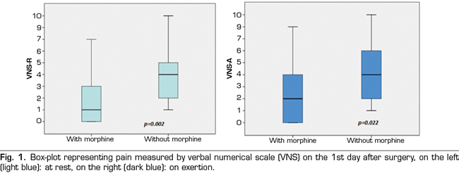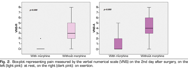 Results: a total of 46 patients were evaluated, 20 patients belonged to the group for conventional analgesia and 26 belonged to the group of morphine PCA. We did not find significative differences in the demographic characteristics in both groups. PCA group had a smaller NRS compared to the other conventional analgesia group during the first 24 and the 48 hours. The difference was statistically significant for pain control during activity and resting. The incidence of secondary effects was greater for the PCA group (46,15 %) than for the acetaminophen and NSAIDs group (15 %).