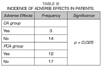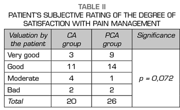 Resultados: Se evaluaron un total de 46 pacientes, 20 del grupo de tratamiento de analgesia convencional y 26 tratados con PCA de cloruro mórfico. No hallamos diferencias significativas en las características demográficas de los grupos. El grupo de PCA tuvo una EVN menor que el grupo de analgesia convencional a las 24 horas y a las 48 horas. La diferencia fue estadísticamente significativa, tanto para el dolor en reposo como para el dolor en actividad. La incidencia de efectos secundarios fue mayor en el grupo PCA (46,15 %) frente al grupo de analgesia con paracetamol y AINE (15 %).