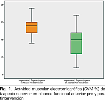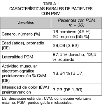 Methods: A sample of 36 participants with latent PGM diagnosis was selected. They underwent an intervention with dry puncture and the variables of pain with VAS and muscular activity of the upper trapezius were measured before and after the intervention in a gesture of anterior reach.