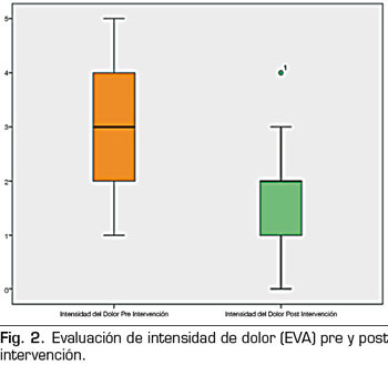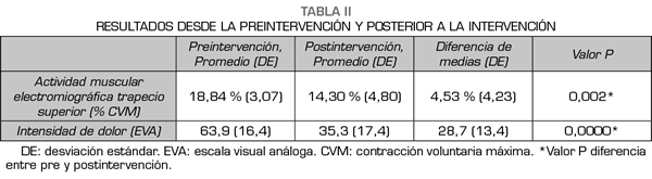 Resultados: Posterior a la aplicación de PS, la actividad muscular disminuyó en un 4,53 % (p = 0,002), el dolor en un 1,53 cm (p = 0,000).