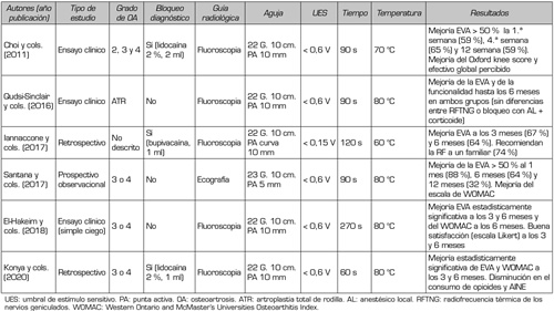 Results: After analyzing five open clinical trials, one cross-sectional study, four prospective observational studies, eight neuroanatomy studies, three retrospective studies, four clinical cases, two case series, three literature reviews and three randomized, double blind, controlled trials; we found genicular nerve radiofrequency achieves a pain reduction and functional improvement with a variable duration, between three and twelve months. There is no consensus regarding the neuroanatomy of the knee joint capsule, the location of the targets, the radiofrequency parameters used and the usefulness of diagnostic blocks.