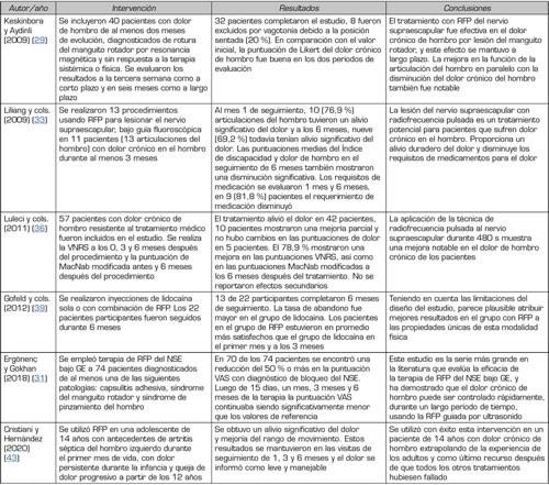 7. Esparza JM. Valoración de la eficacia de la radiofrecuencia pulsada sobre el nervio supraescapular frente a radiofrecuencia pulsada sobre nervio supraescapular y circunflejo en el tratamiento del hombro doloroso [Tesis Doctoral]; 2021.