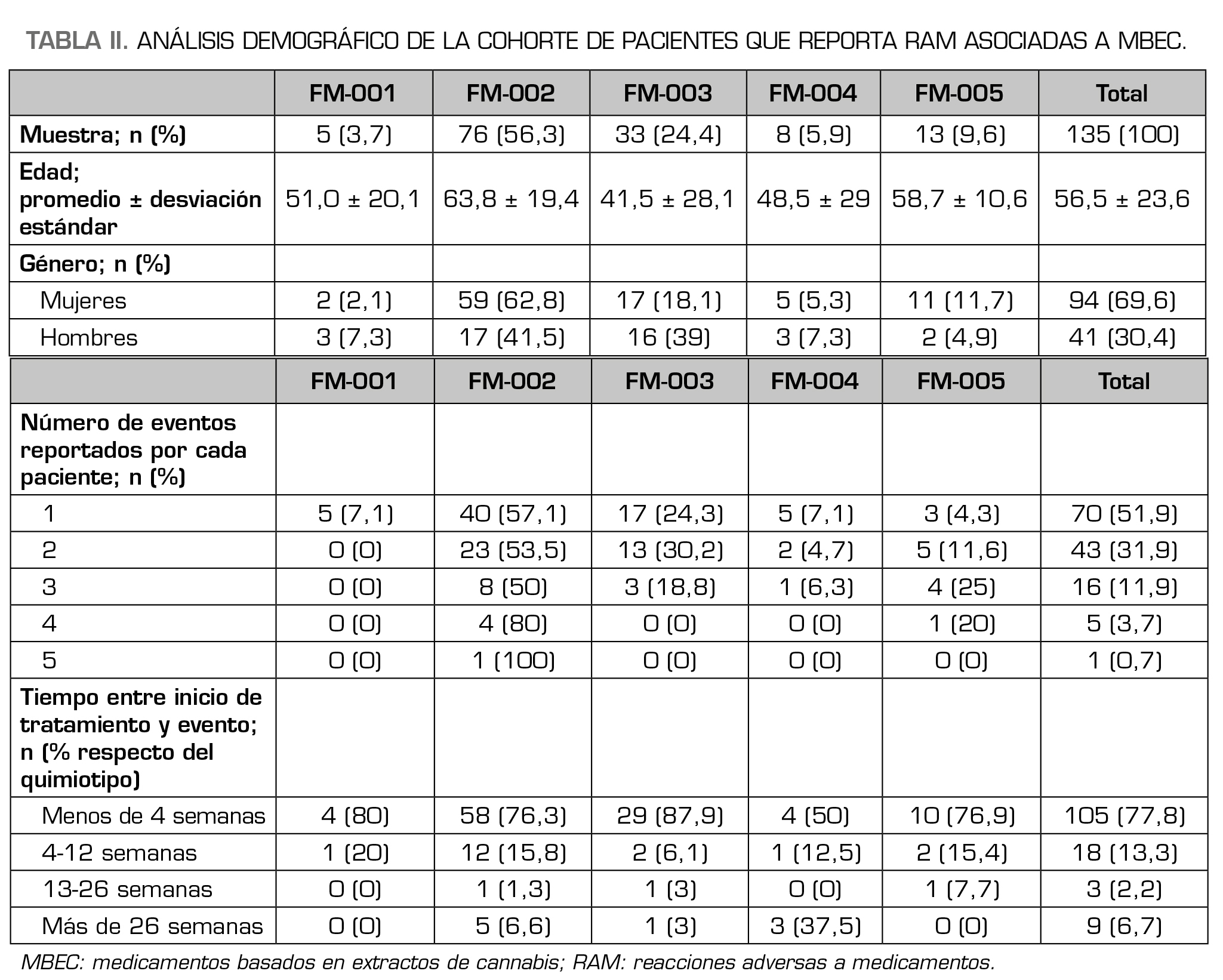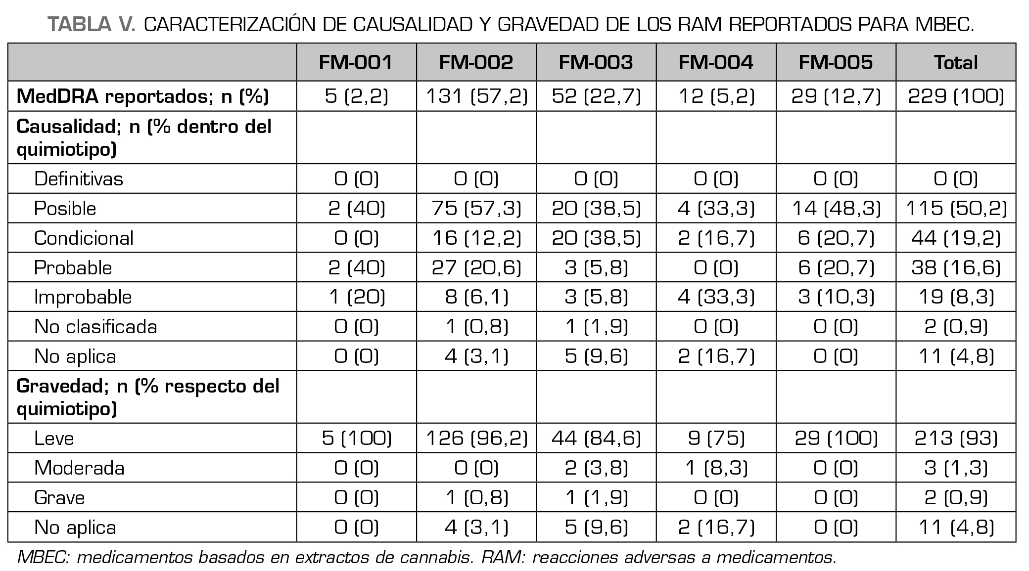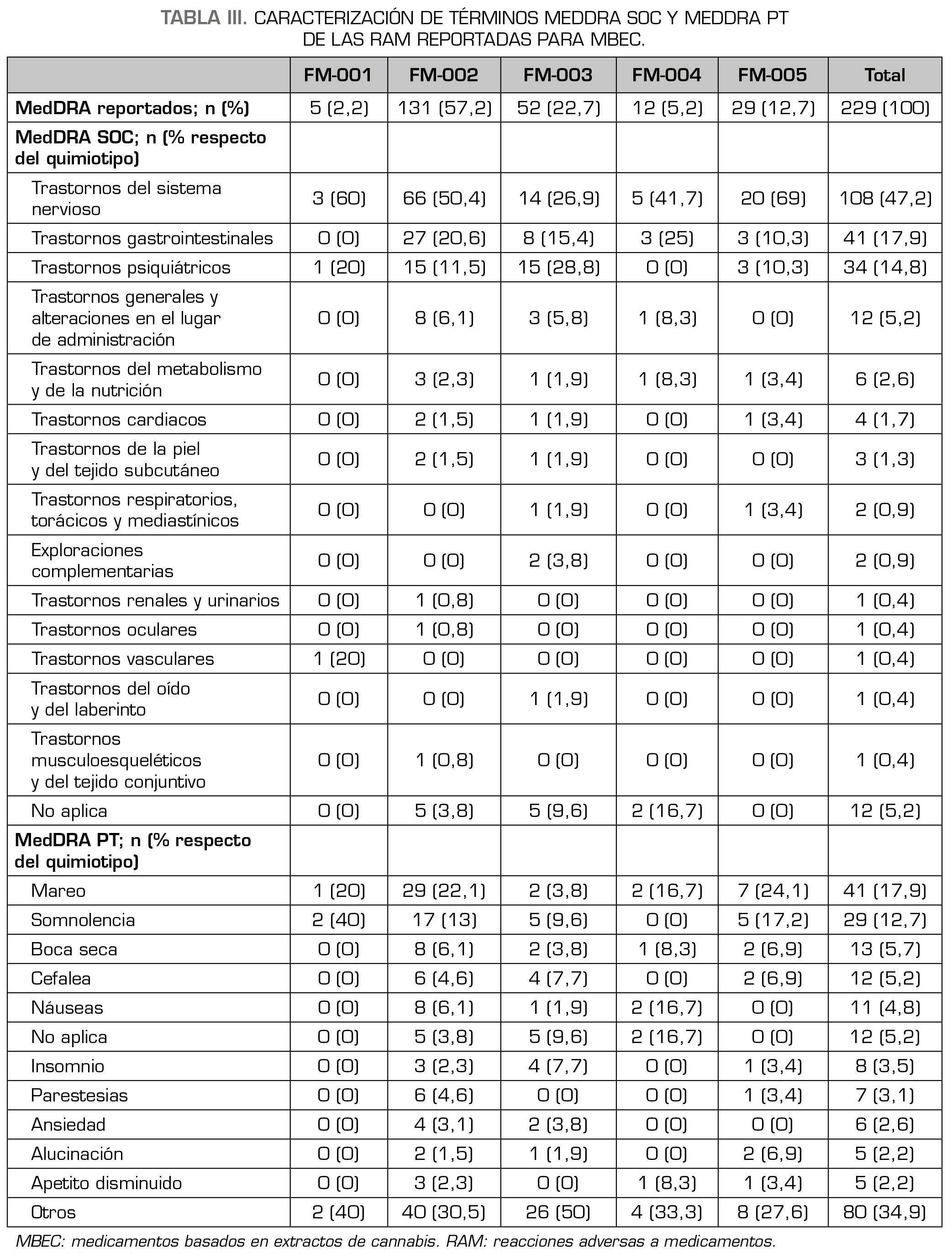 Resultados: De los pacientes que recibieron tratamiento con MBEC (n = 1060), solo 135 (12,7 %) reportaron al menos una reacción adversa. Las mujeres reportaron significativamente más RAM que los hombres (χ2 = 27,4; p = < 0,001) y la mayor parte de las RAM (77,8 %) ocurrieron en las primeras 4 semanas de tratamiento. La distribución de las RAM asociadas a cada producto fue proporcional a la frecuencia de prescripción de este y no se encontró una mayor incidencia en MBEC que contuvieran delta-9-tetrahidrocannabinol. Las reacciones adversas reportadas más frecuentemente correspondieron a trastornos del sistema nervioso (47,2 %) y trastornos gastrointestinales (17,9 %), los términos preferentes fueron mareo (17,9 %), somnolencia (12,7 %) y boca seca (5,7 %). El 93 % se caracterizaron como “leves” y el 50,2 % como “posibles”.
