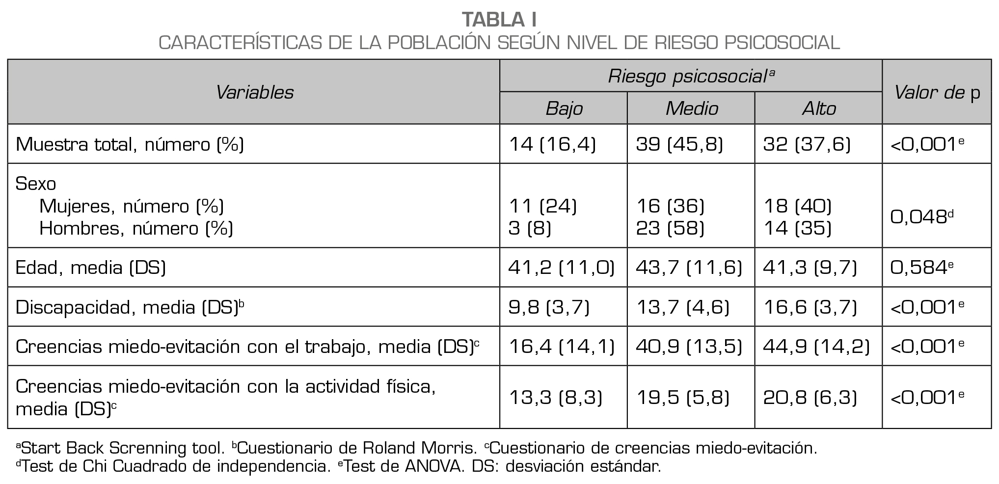 Resultados: Fueron incluidos 85 pacientes con DLCI (edad = 42 ± 11; 53 % mujeres). Las tasas de prevalencia de riesgo alto, medio y bajo riesgo según SBST fue de 16.47 %, 45.88 % y 37.64 %, respectivamente. Los resultados del modelo de regresión logística indicaron que existe una asociación positiva entre las creencias miedoevitación asociadas al trabajo y la discapacidad. Las razones de Odds indicaron que a mayor discapacidad (OR = 1.21; IC 95 % = 1.00-1.47) y creencias miedo-evitación asociadas al trabajo (OR = 1.13; IC 95 % = 1.06-1.20) la probabilidad de riesgo psicosocial es mayor.