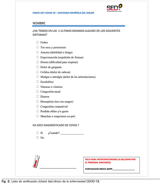 29. Sociedad Española del Dolor. Check list COVID-19/Sociedad Española del Dolor [Internet]. 13 de mayo de 2020 [consultado el 27 de mayor de 2020]. Disponible en: https://www.sedolor.es/download/check-list-covid-19-sociedad-espanola-del-dolor/
