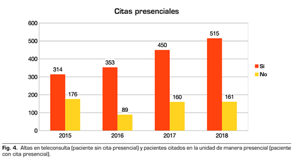 Resultados: Entre enero de 2015 y diciembre de 2018 se han solicitado un total de 2218 teleconsultas. Fueron realizadas desde 42 centros de salud de un total de 42 del EOXI. De las 2218 teleconsultas recibidas, el 49 % fueron preferentes. Respecto a la capacidad de resolución, el 26 % (586) de los pacientes son dados de alta de forma telemática y el 74 % (1632) son citados en la UD.