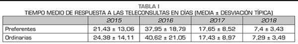 Los tiempos de respuesta medios para el periodo de tiempo estudiado fueron: 21 días para las teleconsultas preferentes y de 22 para las ordinarias.