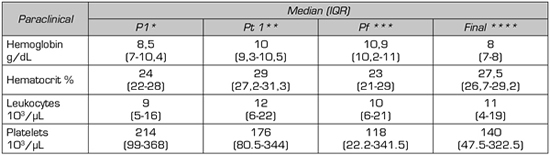 Methods: Retrospective cohort, in patients with a cancer diagnosis who received transfusions in the last six months of life, a non-probabilistic sampling of consecutive cases was executed. The analysis was carried out in SPSS, estimating absolute and relative frequencies and median with interquartile ranges.
