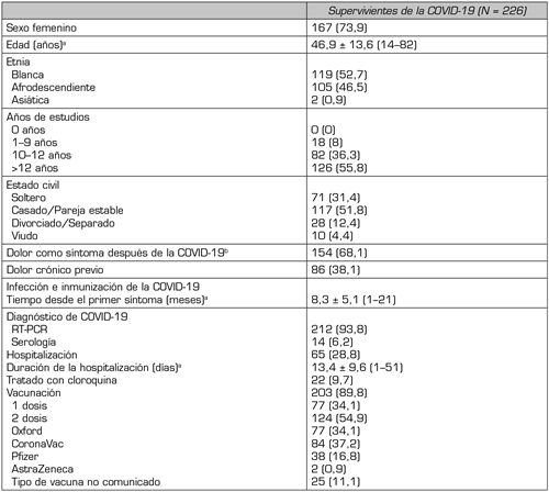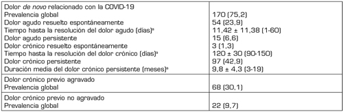 Resultados: El presente estudio incluyó 226 individuos, 177 (78,3 %) de los cuales se presentaron pasados más de 3 meses desde el primer síntoma de COVID-19. Tenían dolor de nueva aparición 170 (75,2 %) de los participantes y dolor crónico 116 (68,2 %). El curso crónico se asociaba a hospitalización por COVID-19, fatiga de nueva aparición, menor rendimiento cognitivo, déficits motores y sensitivos térmicos, alteraciones del ánimo y el sueño, y niveles generalmente inferiores de calidad de vida. El DN probable afectaba a solo el 7,6 % de los pacientes con dolor de nueva aparición y se asociaba a cronificación del dolor, fatiga de nueva aparición, déficits motores y de sensación térmica, alodinia mecánica y tasas menores de vacunación frente al SARS-CoV-2. Referían DC previo 86 (38,1 %) individuos, y este había empeorado tras la infección en 66 (76,7 %) de ellos, lo que se asociaba a hipotensión ortostática.
