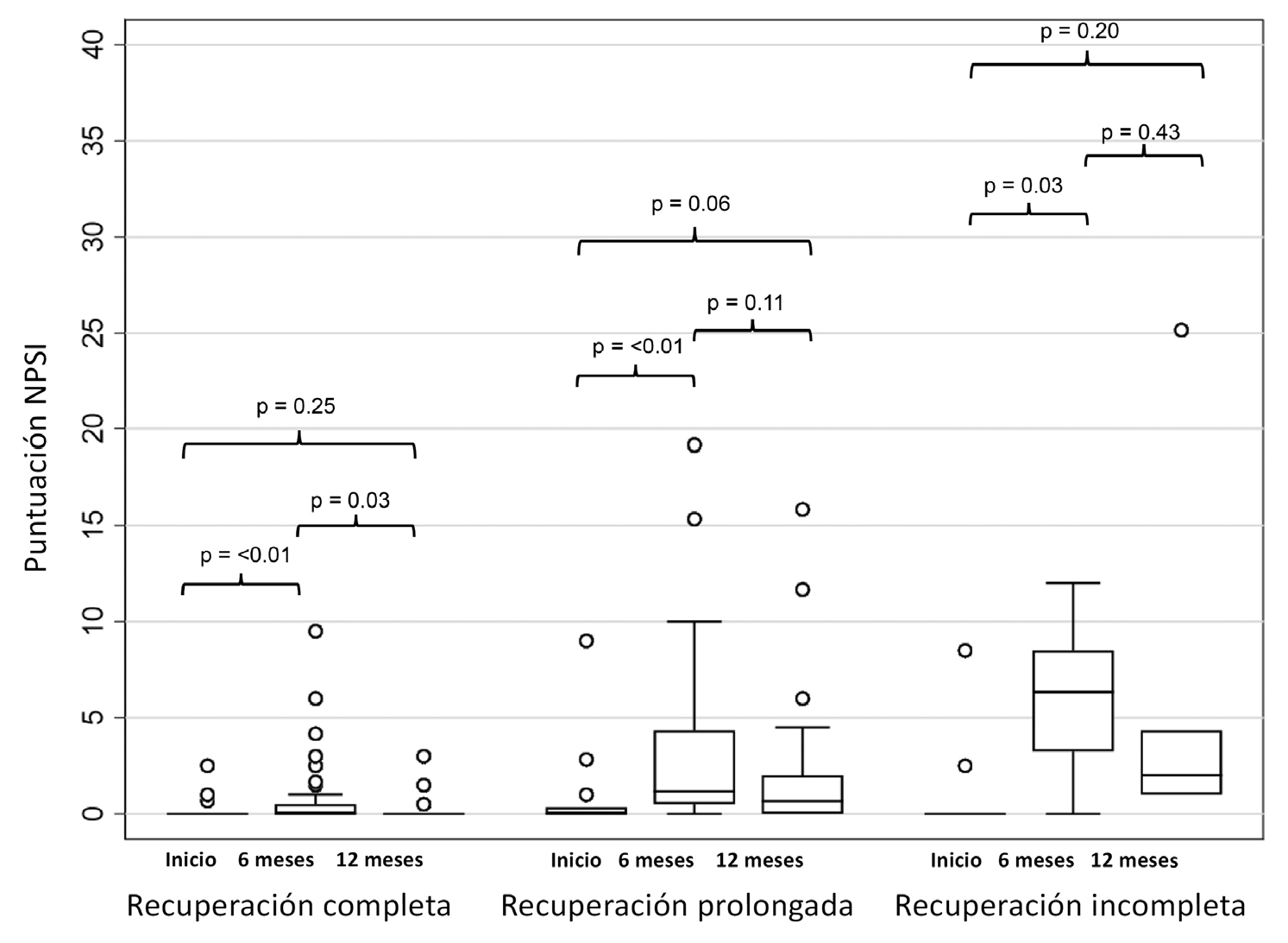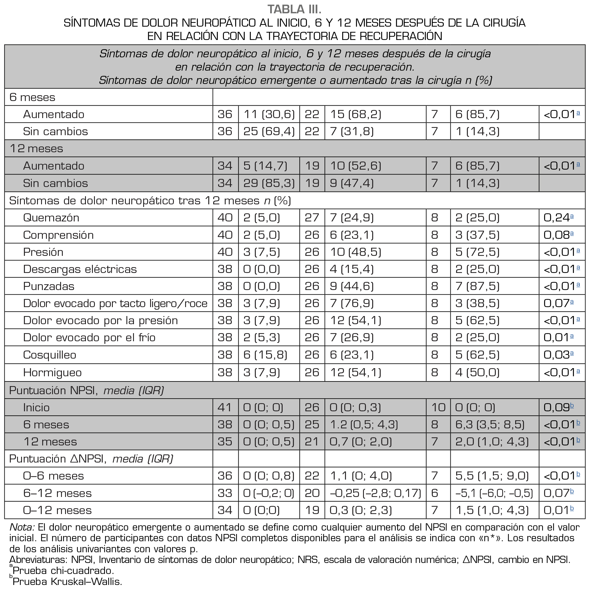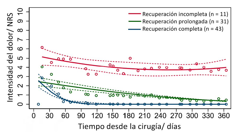 Resultados: Se calculó un modelo de trayectoria que contenía tres grupos de recuperación del dolor a los 12 meses. Un grupo sin PPSP se recuperó totalmente (50 %) en un plazo de dos a tres meses. Otro grupo con PPSP de intensidad leve siguió una trayectoria de recuperación prolongada (37 %), mientras que en el último grupo se observó una recuperación incompleta (13 %). El dolor postoperatorio agudo y la menor edad se asociaron a una trayectoria de recuperación menos favorable. Se observaron más síntomas de dolor neuropático en los pacientes con recuperación incompleta.